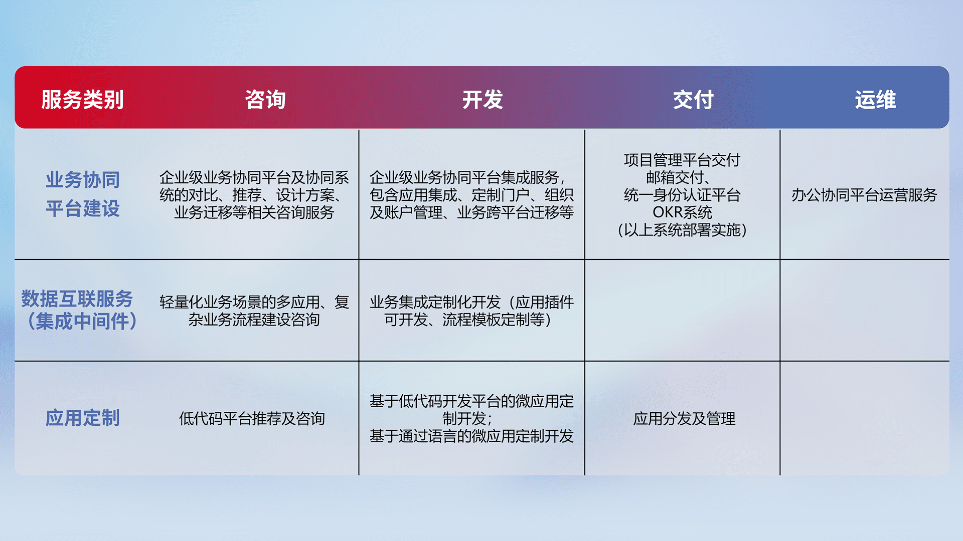 针对钉钉、、、企微、、、IDaas等平台级产品提供产品的规划、、方案、、、、交付、、定制化开发等服务,,实现如统一协同办公、、、智能客户服务、、、混合会议管理、、、智能数据查询、、、、等业务场景,,,实现数字化转型。。